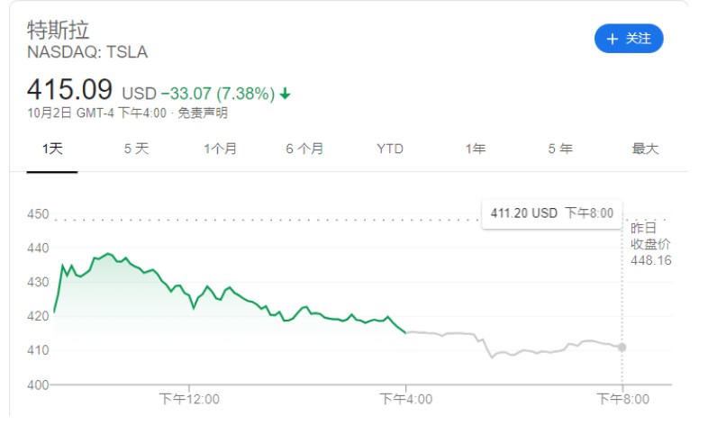 但是当天公司股价表现却是十分糟糕,大幅低开后稍作反抽就一路下探,收盘报415.09美元,跌33.07美元,或7.38%。盘后,特斯拉继续下跌至411.2美元。不过,周一盘前初段,特斯拉股价已反弹至425美元,涨幅逾2%。