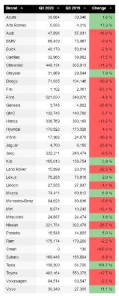 从下图可以看到,特斯拉在2020年成为了美国唯一一家销量实现同比增长的汽车制造商。在其他汽车制造商仍在努力维持运营的情况下,特斯拉的需求却仍在不断上升,2020年的前九个月,该公司销售额增长了65.15%。