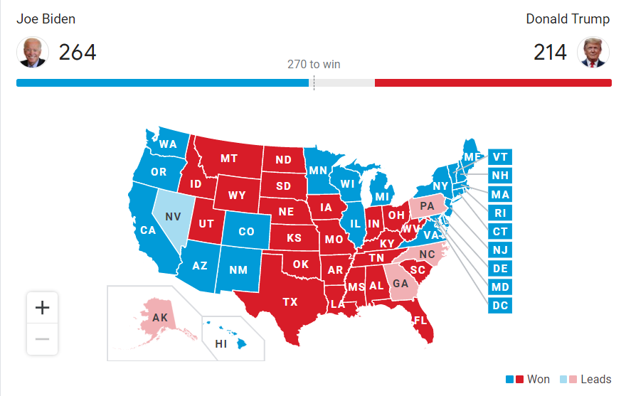 拜登连续拿下威斯康星州和密歇根州两大关键摇摆州后,目前选情发生逆转。据美联社报道,拜登以264:214的选举人票领先特朗普,只差6票就可入主白宫,现在这关键的6票要看内华达州的票数。在参议院控制权争夺方面,目前两党都获得48席,而众议院席位民主党以204:190暂时领先于共和党。从目前选情来看,共和党有望拿下参议院,民主党则很有可能拿下众议院。