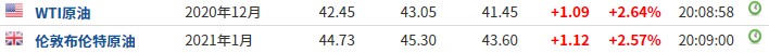 截至发稿,WTI原油涨2.64%,报42.45美元/桶。布伦特原油涨2.57%,报44.73美元/桶。