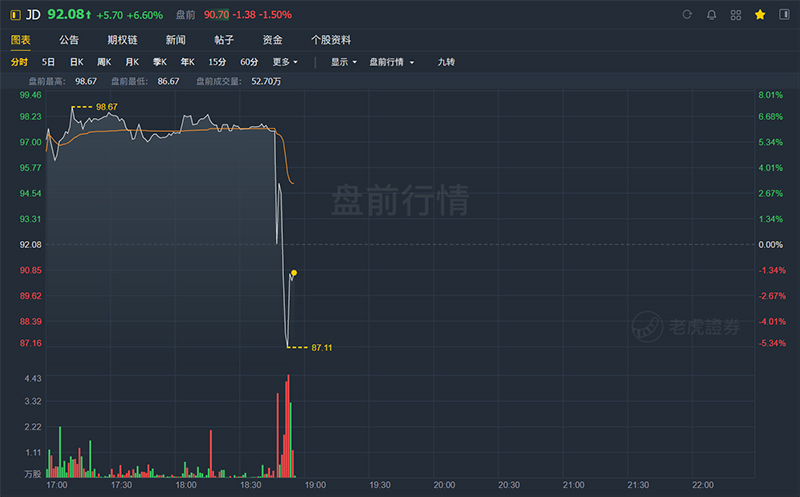 财报发布后,京东美股盘前直线“跳水”,由涨超6%快速至跌超1%。