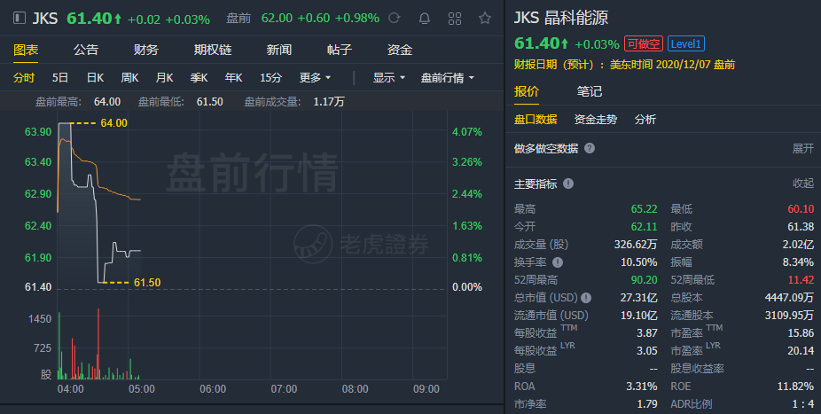 截至发稿,晶科能源盘前涨0.98%。