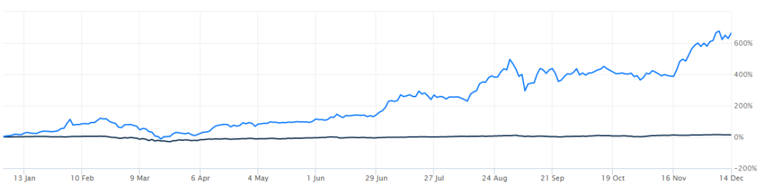 特斯拉(蓝)与标普500指数(黑)今年迄今为止涨跌幅对比