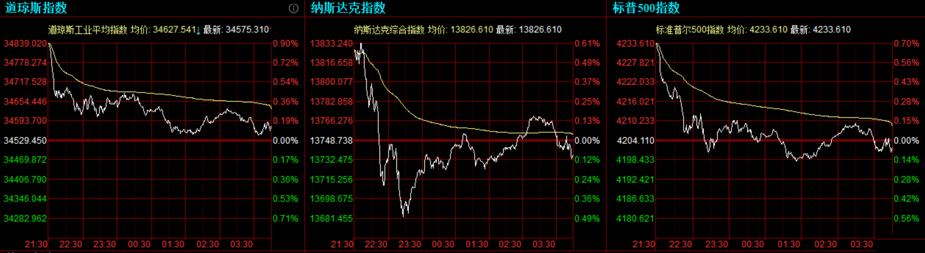 道指收涨45.86点,或0.13%,报34575.31点;纳指跌12.26点,或0.09%,报13736.5点;标普500指数跌2.07点,或0.05%,报4202.04点。