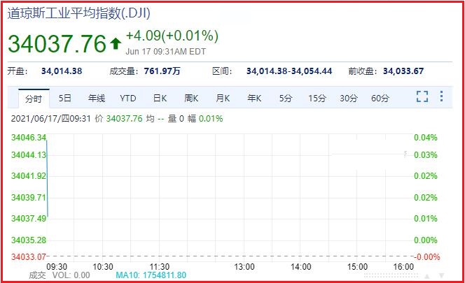 美国道琼斯指数实时行情分析(2021年6月17日)