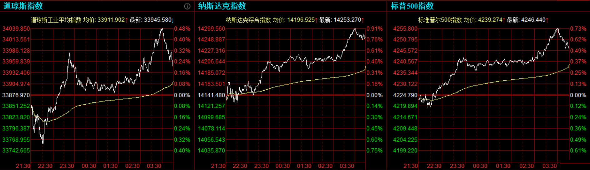 道指收涨68.61点,或0.2%,报33945.58点;纳指涨111.79点,或0.79%,报14253.27点,最高上涨至14269.77点,创盘中与收盘历史新高;标普500指数涨21.65点,或0.51%,报4246.44点,逼近历史高位。