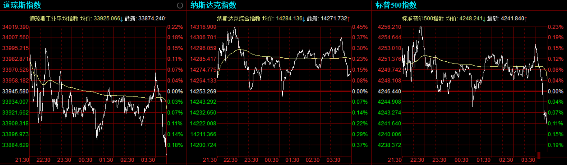 道指收跌71.34点,或0.21%,报33874.24点;纳指涨18.46点,或0.13%,报14271.73点;标普500指数跌4.6点,或0.11%,报4241.84点。