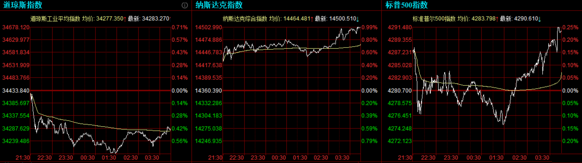 道指跌150.57点,或0.44%,报34283.27点;纳指涨140.12点,或0.98%,报14500.51点;标普500指数涨9.91点,或0.23%,报4290.61点。