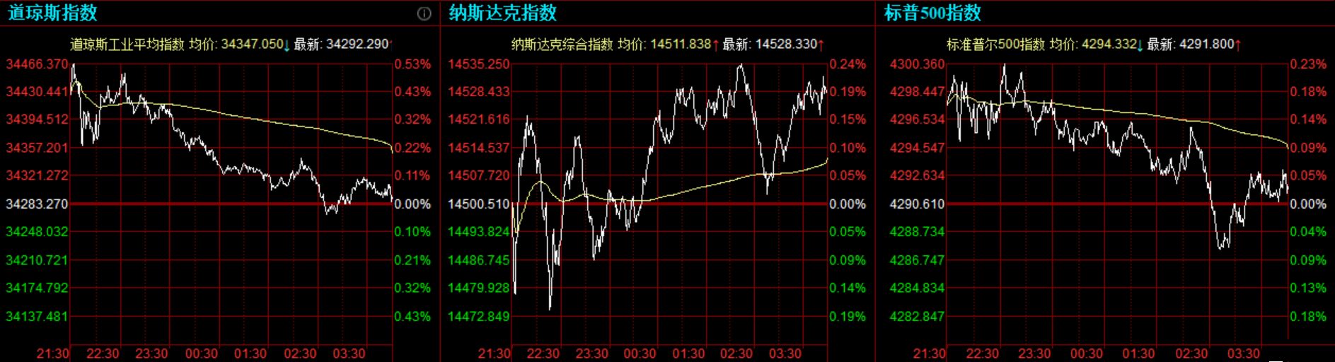道指涨9.02点,或0.03%,报34292.29点;纳指涨27.83点,或0.19%,报14528.33点,最高上涨至14535.97点;标普500指数涨1.19点,或0.03%,报4291.8点,最高上涨至4300.52点。