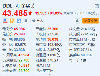 叮咚买菜(DDL.US)恢复交易后,盘中一度大涨95.5%至45.984美元,市值站上100亿美元,换手率近60%。
