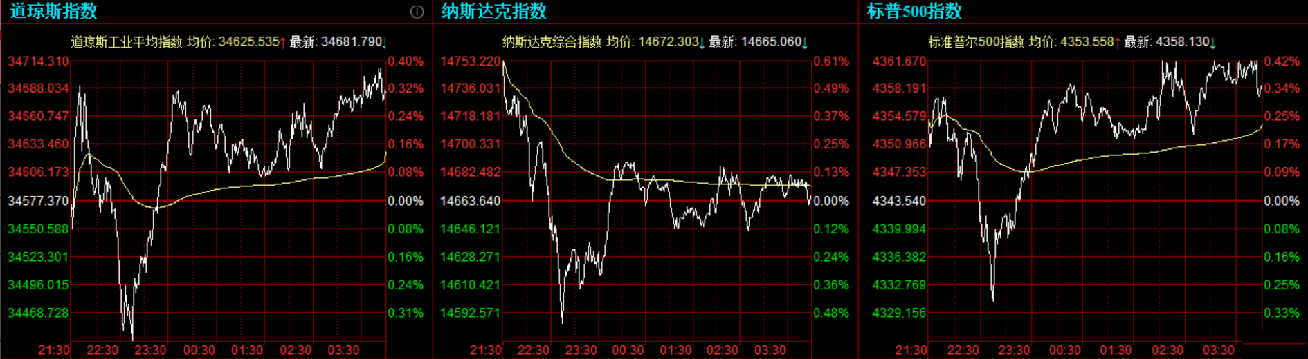 道指收涨104.42点,或0.3%,报34681.79点;纳指涨1.42点,或0.01%,报14665.06点;标普500指数涨14.6点,或0.34%,报4358.14点。