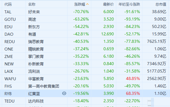 网上广泛流传的一份“双减”文件导致中概教育股全线崩盘。好未来(TAL.US)跌70.76%,高途(GOTU.US)跌63.26%,新东方(EDU.US)跌54.22%,三股均创历史单日最大跌幅。据悉,文件的主要条款包括禁止在法定节假日、周末和寒暑假进行课外辅导活动,以及限制学术辅导机构上市。有机构预测,在周末、节假日、寒暑假的课外辅导活动受限制的情况下,好未来的营收将下降80%,新东方的营收将下降60%。