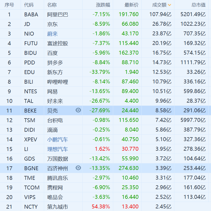 以互联网平台为主的中概龙头股延续调整走势,在开盘后一度快速拉升的背景下最终走弱,再度录得普遍大跌,多家中概龙头跌幅达两位数。教育股跌幅居前,新东方跌超33%,高途跌超28%,好未来跌超26%。腾讯控股ADR跌超10%,拼多多、京东跌超8%,阿里巴巴跌超7%,富途控股跌7.37%,百度跌近6%,哔哩哔哩跌逾8%,网易跌13.65%,贝壳跌27.69%。