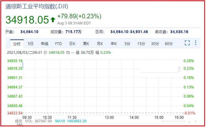 1,截止发稿时间,道琼斯报于34889.64,成交量939.52万