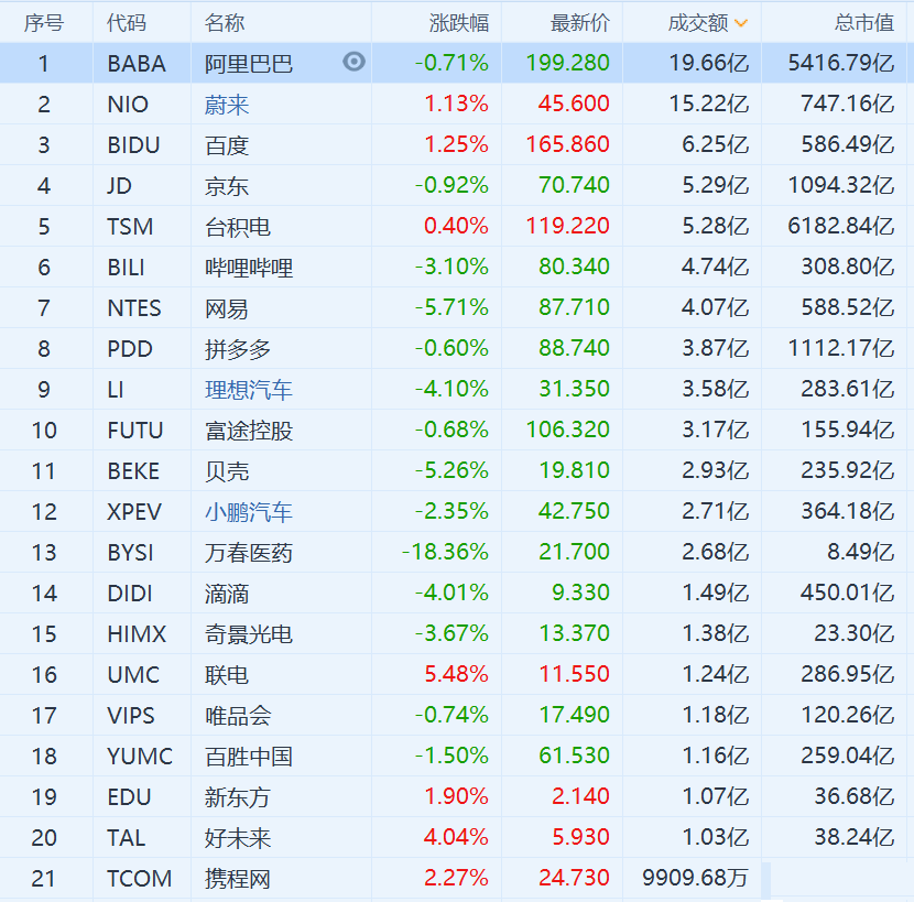 中概教育股普涨,好未来涨4.04%,高途涨0.91%,新东方涨1.9%。精锐教育在上一日暴涨73.01%后跌20.77%。热门中概股多数下跌,网易跌超5%,滴滴跌超4%,百度涨1.25%,拼多多跌0.6%,阿里巴巴跌0.71%,京东跌0.92%,爱奇艺跌2.76%,满帮跌4.55%。