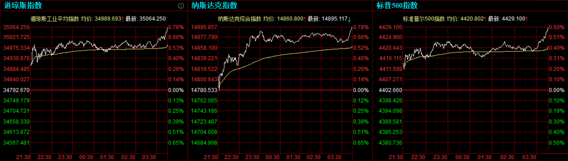 道指收涨271.58点,或0.78%,报35064.25点;纳指涨114.58点,或0.78%,报14895.12点,午后最高上涨至14896.47点,创盘中历史新高;标普500指数涨26.44点,或0.6%,报4429.1点。