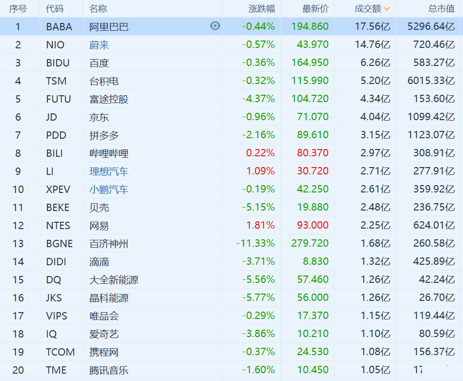 热门中概多数收跌,好未来跌超5%,新东方和高途跌超2%,拼多多也跌超2%,京东跌近1%,阿里巴巴和百度跌0.4%左右,贝壳跌逾5%,富途跌4.37%,但陆金所涨超1%,腾讯ADR涨近0.7%,网易涨1.8%。