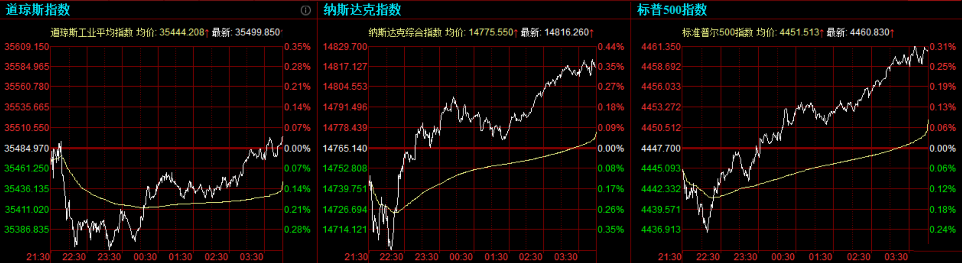 道指收涨14.88点,或0.04%,报35499.85点;纳指涨51.13点,或0.35%,报14816.26点;标普500指数涨13.13点,或0.3%,报4460.83点。道指最高上涨至35510.77点,标普500指数最高上涨至4461.77点,均创盘中历史新高。