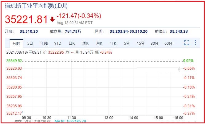1、截止发稿时间,道琼斯报于35203.87:,成交量:983.34万