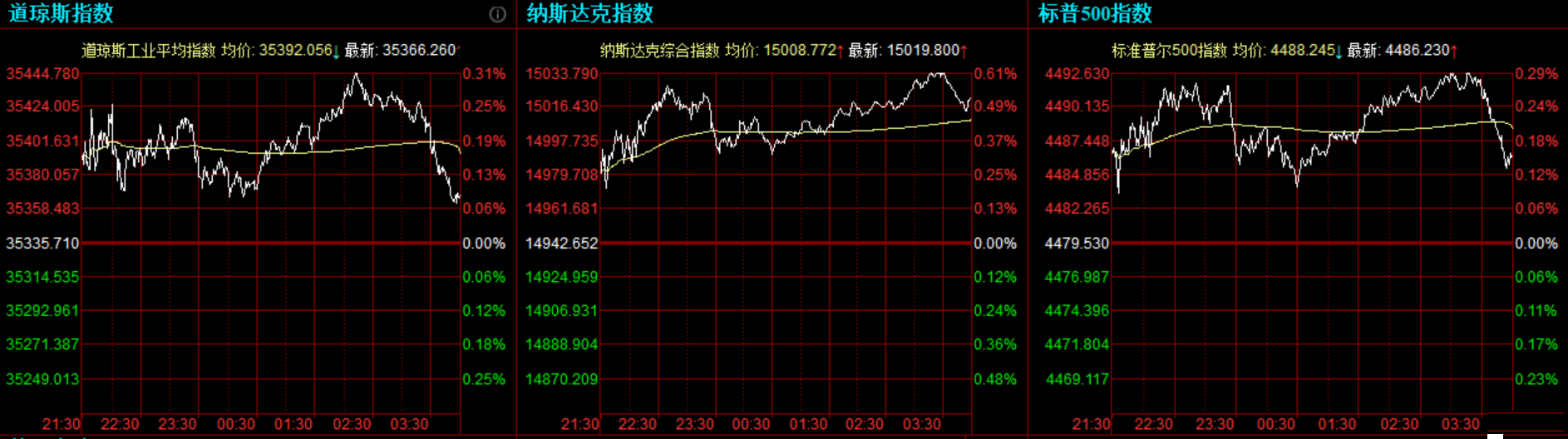 道指收涨30.55点,或0.09%,报35366.26点;纳指涨77.15点,或0.52%,报15019.80点;标普500指数涨6.70点,或0.15%,报4486.23点。周二纳指最高上涨至15034.89点,标普500指数上涨至4492.81点,均创盘中历史新高。