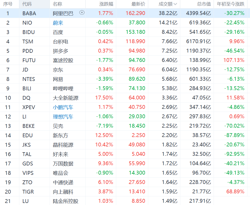 中概股继续跟随政策面波动,网易、哔哩哔哩在未成年人游戏新政影响下开盘大跌但日内收复大部分跌幅,网易收跌逾3%,腾讯ADR跌超1%,哔哩哔哩跌超1%。中概教育股大幅反弹,新东方和高途收涨逾12%,好未来涨5%。