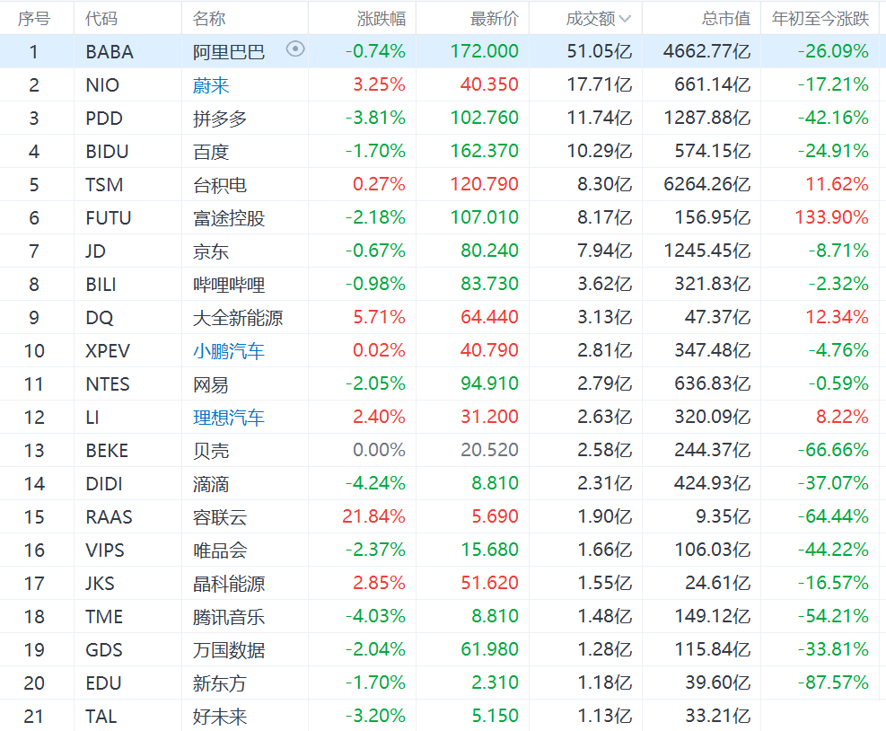 此前连涨数日的热门中概股出现回调,滴滴跌超4%,拼多多、好未来跌超3%,新东方跌近2%,高途教育、腾讯ADR和百度跌超1%,阿里巴巴跌逾0.7%。中概新能源汽车股逆势上涨,蔚来汽车涨3.38%,小鹏汽车涨0.02%,理想汽车涨2.4%。此外,周三涨超10%的知乎继续上扬,收涨超3%。