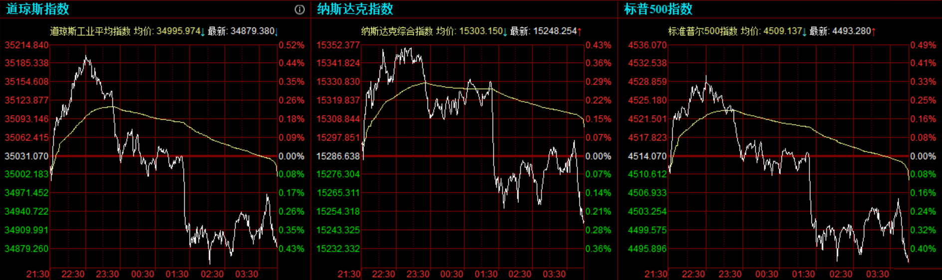 道指收跌151.69点,或0.43%,报34879.38点;纳指跌38.38点,或0.25%,报15248.25点;标普500指数跌20.79点,或0.46%,报4493.28点。