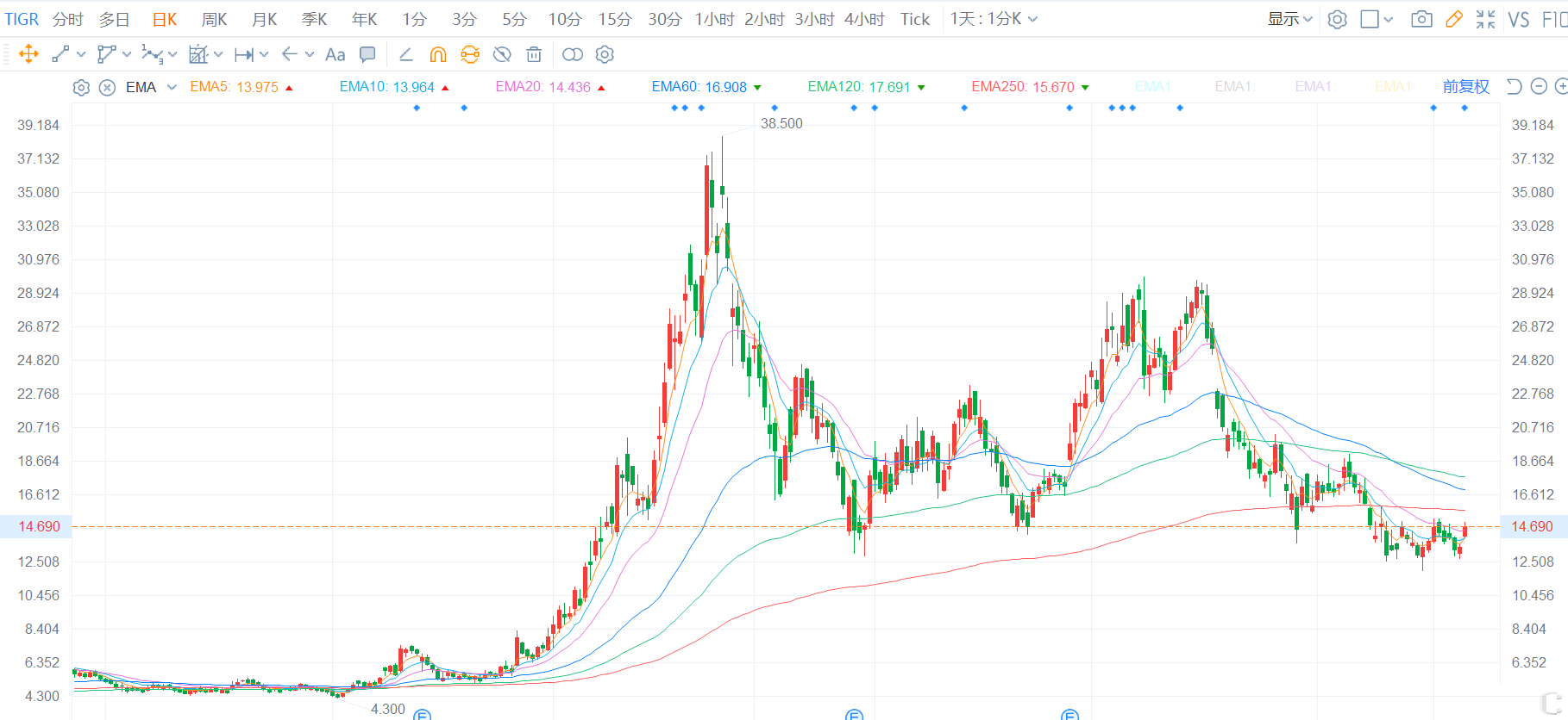 互联网券商老虎证券(TIGR.US)一度涨超11%报14.94美元,市值22亿美元。