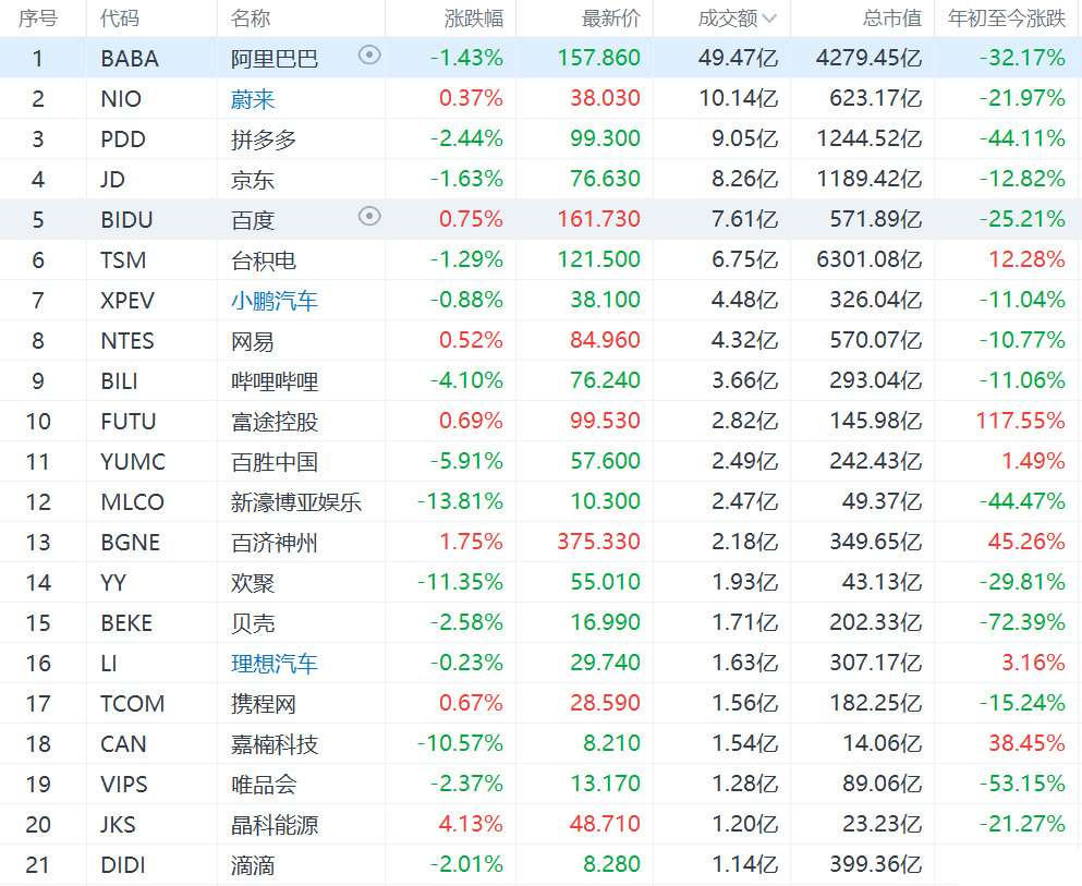 热门中概股多数收跌,阿里巴巴跌1.53%,滴滴跌2.01%,拼多多跌2.44%,腾讯ADR跌2.87%,哔哩哔哩跌4.01%。网易涨0.52%,百度涨0.75%。中概教育股普跌,精锐教育跌0.12%,高途跌2.02%,新东方跌4%,好未来跌6%。