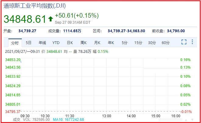 1、截止发稿时间,道琼斯报于:34886.22,成交量:1262.88万