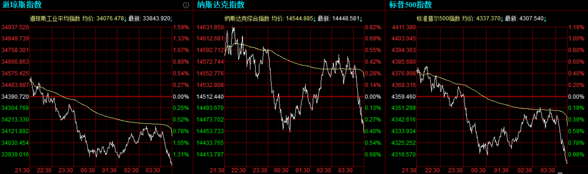 道指跌546.80点,或1.59%,报33843.92点;纳指跌63.86点,或0.44%,报14448.58点;标普500指数跌51.92点,或1.19%,报4307.54点。