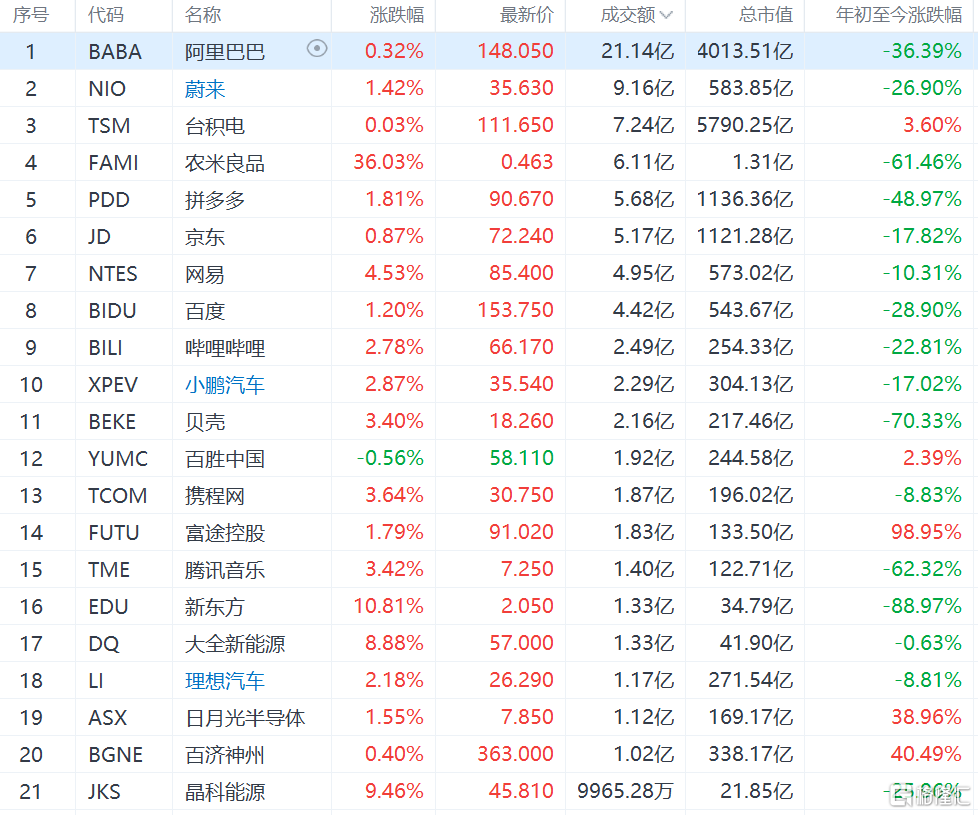 热门中概股集体上涨,阿里巴巴涨0.32%,京东涨0.87%,百度涨1.20%,拼多多涨1.81%,微博涨2.48%,哔哩哔哩涨2.78%,网易涨4.53%,腾讯ADR涨2.52%,腾讯音乐涨3.42%,爱奇艺涨3.88%,滴滴涨0.13%,新东方涨10.81%,好未来涨9.75%,高途涨9.64%。