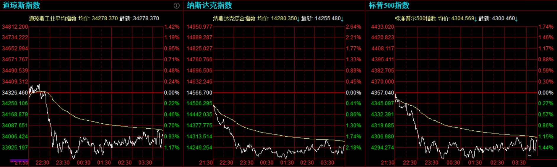 道指收跌323.54点,或0.94%,报34002.92点;纳指跌311.21点,或2.14%,报14255.48点,创6月以来新低;标普500指数跌56.58点,或1.3%,报4300.46点,创7月19日以来新低。