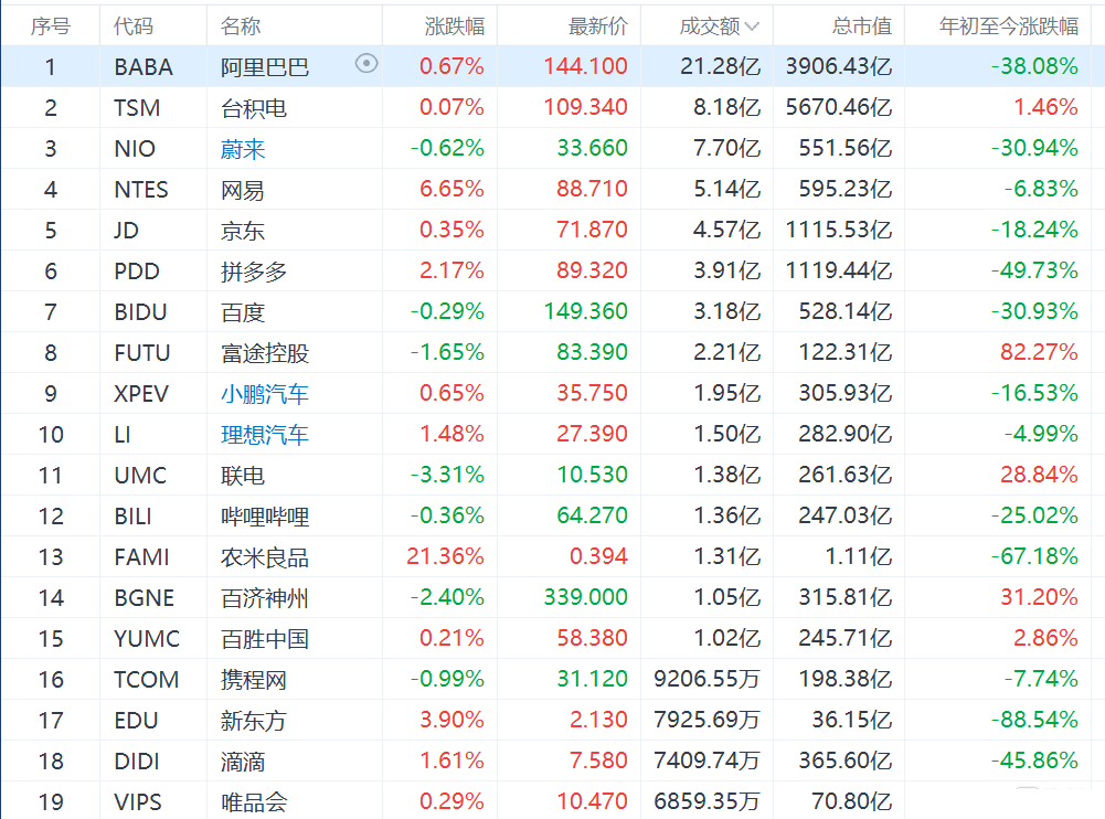 中概股涨跌互现,纳斯达克金龙指数涨0.49%,收于10150点。热门股中,网易涨6.65%,拼多多涨2.17%,滴滴涨1.61%,阿里巴巴涨0.67%,京东涨0.35%,百度跌0.29%,腾讯ADR跌0.67%。中概教育股多数收涨,高途大涨8.2%,新东方涨3.9%,好未来涨3.14%。