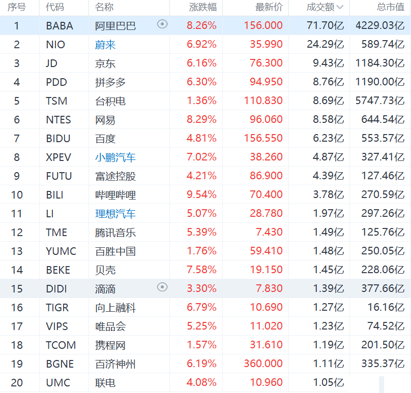 中概股也跟随大盘大幅走高,纳斯达克金龙指数涨5.4%,收于10698点。雾芯科技涨12.26%,有道涨11.93%,虎牙涨10.88%,知乎涨10.79%,爱奇艺涨9.66%,哔哩哔哩涨9.54%,网易涨8.29%,阿里巴巴涨超8.26%,腾讯ADR涨7.80%,拼多多涨6.30%,滴滴涨3.30%,好未来涨3.26%。