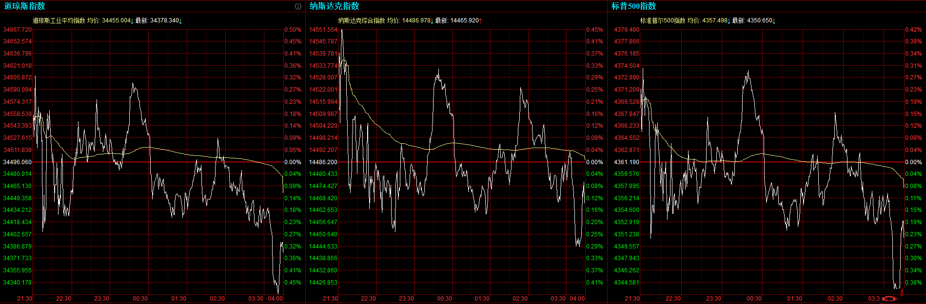 道指收跌117.72点,或0.34%,报34378.34点;纳指跌20.28点,或0.14%,报14465.92点;标普500指数跌10.54点,或0.24%,报4350.65点。