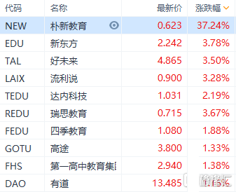 中概教育股普涨,朴新教育涨37.2%,新东方、好未来、流利说涨超3%。