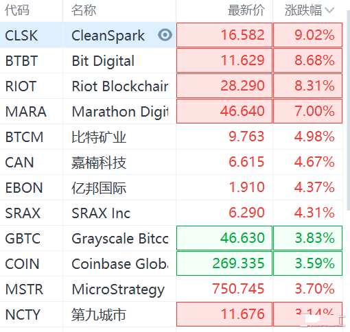 比特币时隔半年再度触及60000美元/枚大关,美股区块链股集体走高。Bit Digital(BTBT.US)、Riot Blockchain(RIOT.US)涨超8%,Marathon Patent(MARA.US)涨7%,比特矿业(BTCM.US)、嘉楠科技(CAN.US)涨超4%。