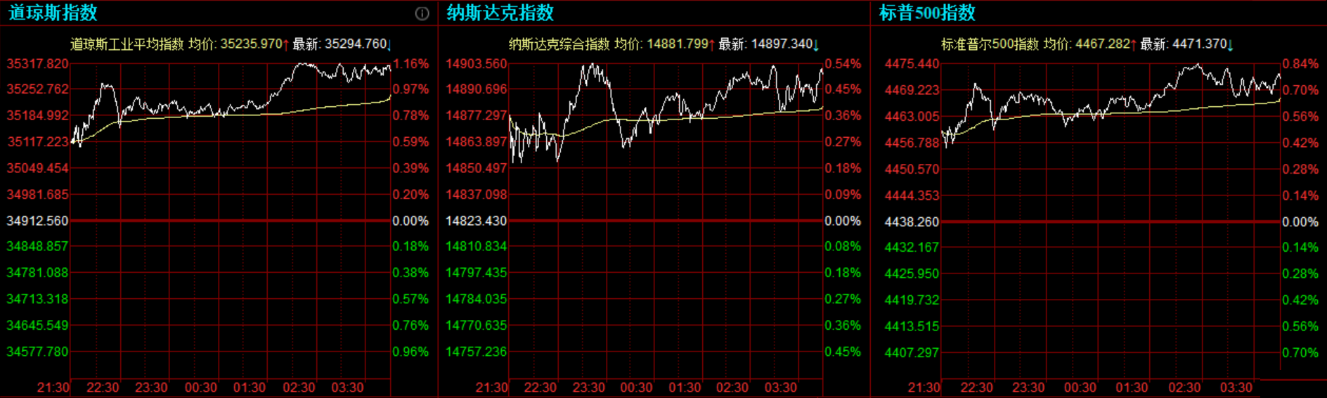 道指涨382.2点,或1.09%,报35294.76点;纳指涨73.91点,或0.5%,报14897.34点;标普500指数涨33.11点,或0.75%,报4471.37点。本周道指上涨1.58%,纳指上涨2.18%,标普500指数上涨1.82%。