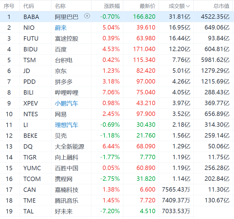 热门中概股多数上涨,京东涨1.23%,微博涨2.57%,拼多多涨3.18%,哔哩哔哩涨7.06%,百度涨4.53%,新东方跌0.84%,网易涨2.45%,阿里巴巴跌0.70%,腾讯音乐涨1.45%,爱奇艺跌1.39%,滴滴跌0.24%,雾芯科技涨9.63%。