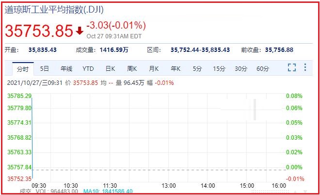1、截止发稿时间,道琼斯报于:35736.89,成交量:1750.65万