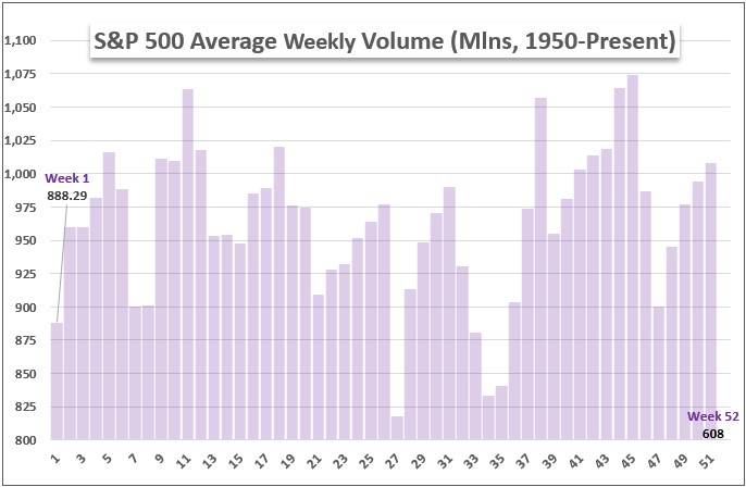 与表现相反,开局一周的交易量(我将其用作参与的代理)的衡量标准提供了显着下降的平均值。这更多地与以下事实有关:根据年份的不同,一月份实际上可以在一周中的不同日子开始。然而,新年后的假期(无论是在每月的第一天还是之后的第一个交易日庆祝)确实会自然减少整个星期的活动。