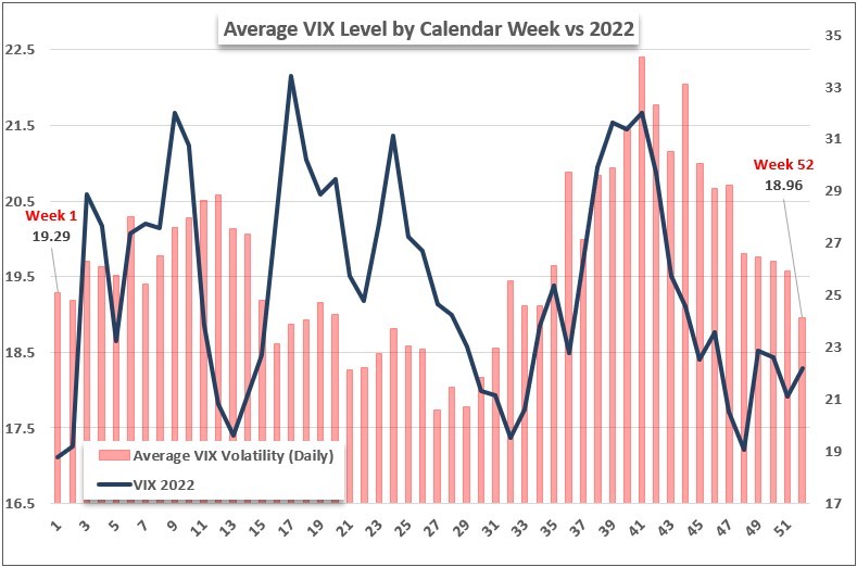 从前一年的最后几周到新一年的开盘,波动性往往会增加。下面,我们看到从 2021 年到 2022 年的过渡大幅下降,但它迅速升级为下滑,最终将我们推向了我们将在今年晚些时候登记的熊市。与全年的平均表现相比,VIX在12月相对平缩,这可能转化为一种观点,即随着流动性的恢复,市场低估了意外和剧烈市场波动的可能性——VVIX(波动率指数)和SKEW(尾部风险指数)的极低读数进一步加剧了这种情况。