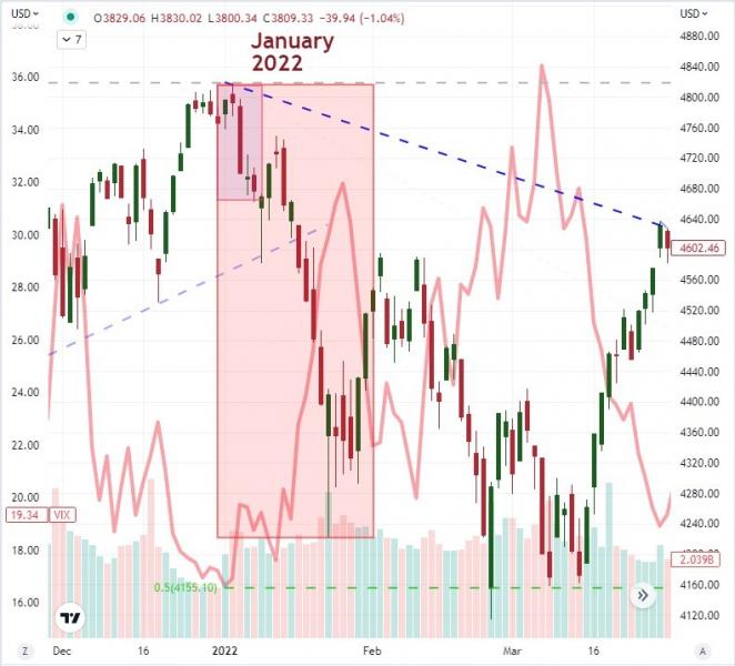 标准普尔 500 指数图表,包含交易量和 VIX 波动率指数,重点关注 2022 年 1 月(每日)