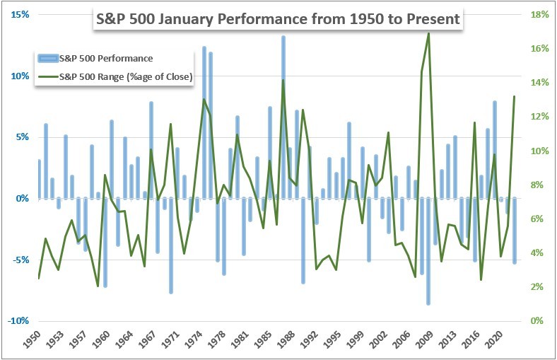 与今年相比,与 3 月或 10 月的极端波动性高峰、5 月的交易量低迷或 11 月至 12 月最强劲的看涨平均值相比,1 月看起来并不特别引人注目。就一月份而言,我想介绍一下每年的表现差异有多大。在一系列令人惊讶的市场参与者中,有一定程度的预期,即一月份的表现将影响全年的表现。碰巧的是,从1950年到去年,开盘月的方向与该光谱73年中的53年中的53年(正面或负面)相匹配。至于活动水平,在过去7年中,1月份的范围从非常活跃到非常安静显着振荡。
