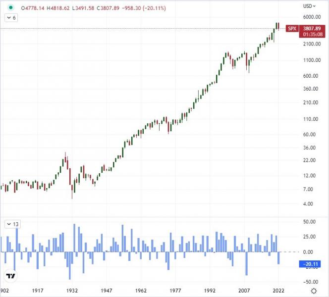 从1900年至今的标准普尔500指数每周表现图表(每周)