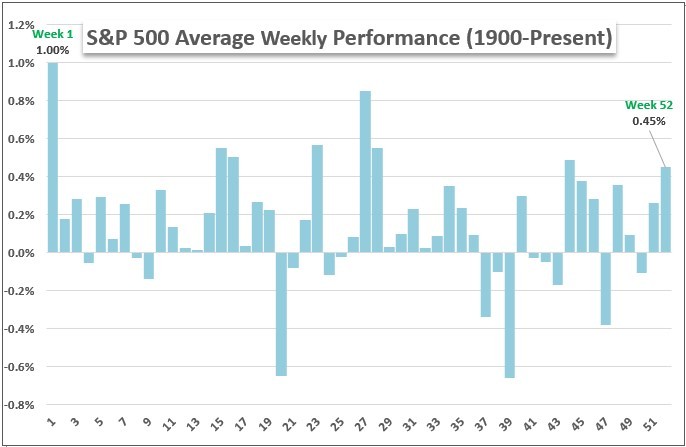 在较短的基础上,今年开局一周的平均读数会有所强劲。将每年分为 52 个日历周,平均表现从 1900 年到 2021 年,一年的第一周是历史上全年表现最强劲的一周。当然,这可能每年都有所不同;但每年年初基金对资本的重新配置是一个相当一致的影响。在没有更紧迫的基本面问题或强烈的情绪风向的情况下,可能会鼓励市场默认季节性常态。