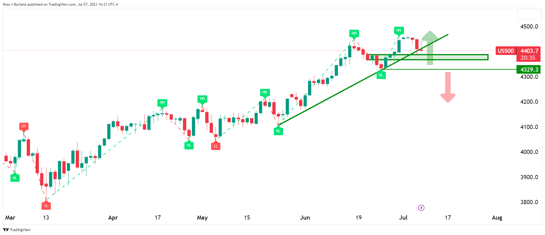 若不断突破形态将使看涨趋势完整,但若跌破4329将维持看跌前景。