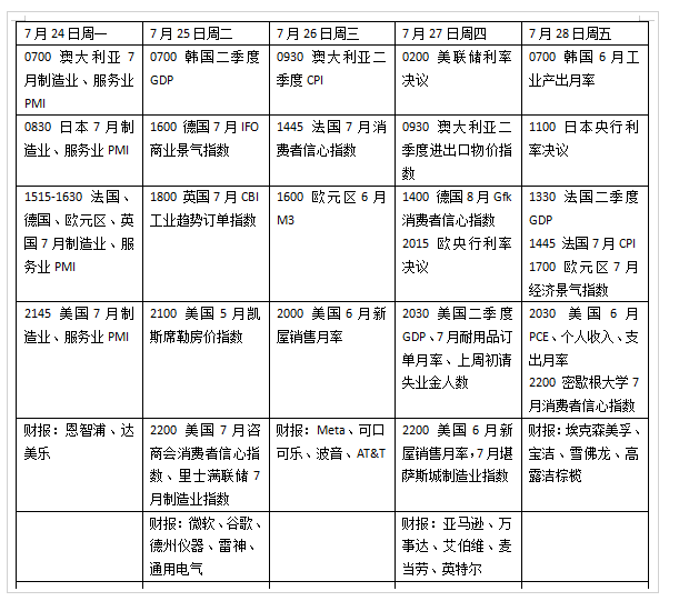 本周看点颇多,美联储、欧央行和日本央行等将公布利率决议,关注美联储7月以后的政策路径线索,日本央行料按兵不动,有关收益率曲线的言论成为焦点。美国将公布二季度国内生产总值(GDP)、6月消费者支出物价指数(PCE)等重磅数据,全球主要经济体将发布7月采购经理人指数(PMI),关注各国经济复苏进程,财报季继续进行,微软、谷歌、Meta、亚马逊等明星股将披露业绩。