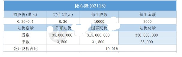 10月14日,捷心隆(02115)配售结束。配售招股价区间为0.36-0.4港元,最终定价0.36港元,每手3600港元。